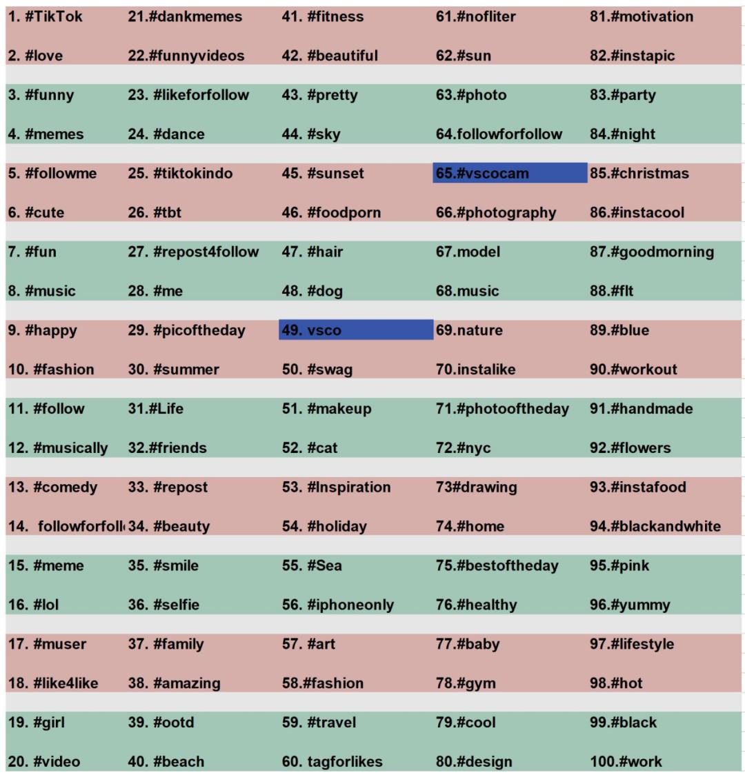 另外,就是笔者刚刚提到的修图 App 大多会认真运营其 TikTok、Instagram 以及 Pinterest 等社交媒体账户,和社交媒体进行深度绑定。另外,如果有开发者看到这里,不要觉得修图 App 无需在 TikTok 上花费太多精力。因为不论是「VSCO」此次凭借 TikTok 再度出圈,还是细看 TikTok Top100 标签,我们会发现有 9 个标签直接和图片有关。