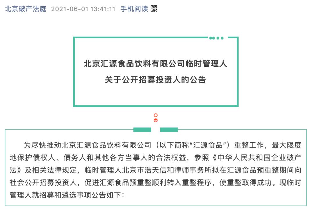 近日,北京破产法庭发布公告称,临时管理人北京市浩天信和律师事务所拟在汇源食品预重整期间向社会公开招募投资人。本次招募投资人旨在完成汇源食品重整,投资人提供资金及资源支持,有效整合产业资源,优化资产负债结构、公司治理结构及人员结构,维护全体债权人的合法利益,化解债务风险,最终打造资产质量优良、公司治理结构完善、具备可持续经营能力和盈利能力的企业。