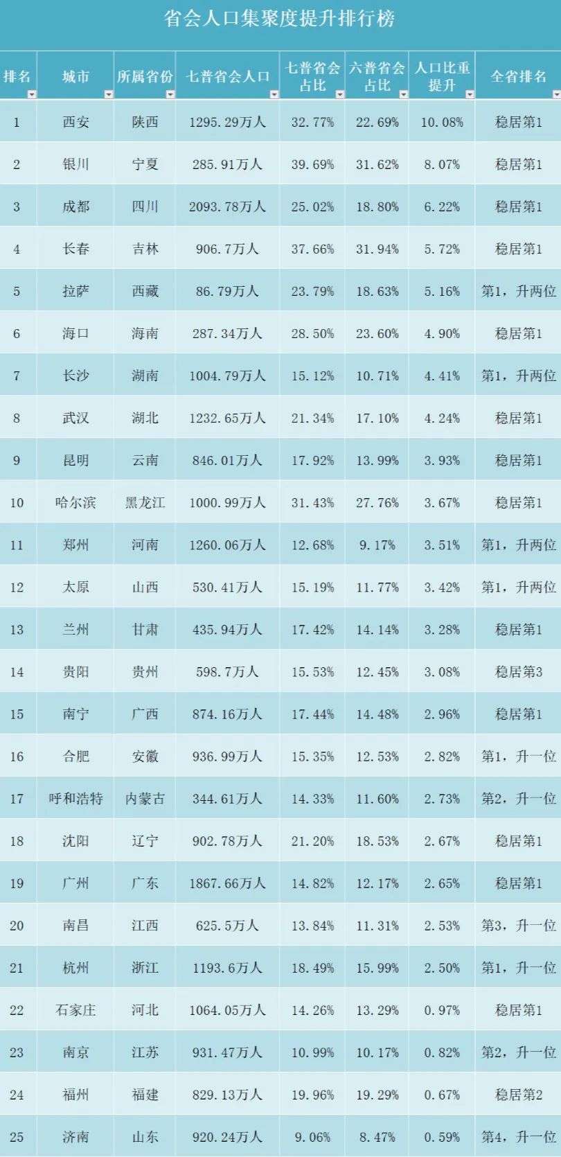 从已公布数据的25个省会城市来看,没有一个在省内的排名是下降的。过去十年,至少有6座省会城市晋升为全省第一人口大市。