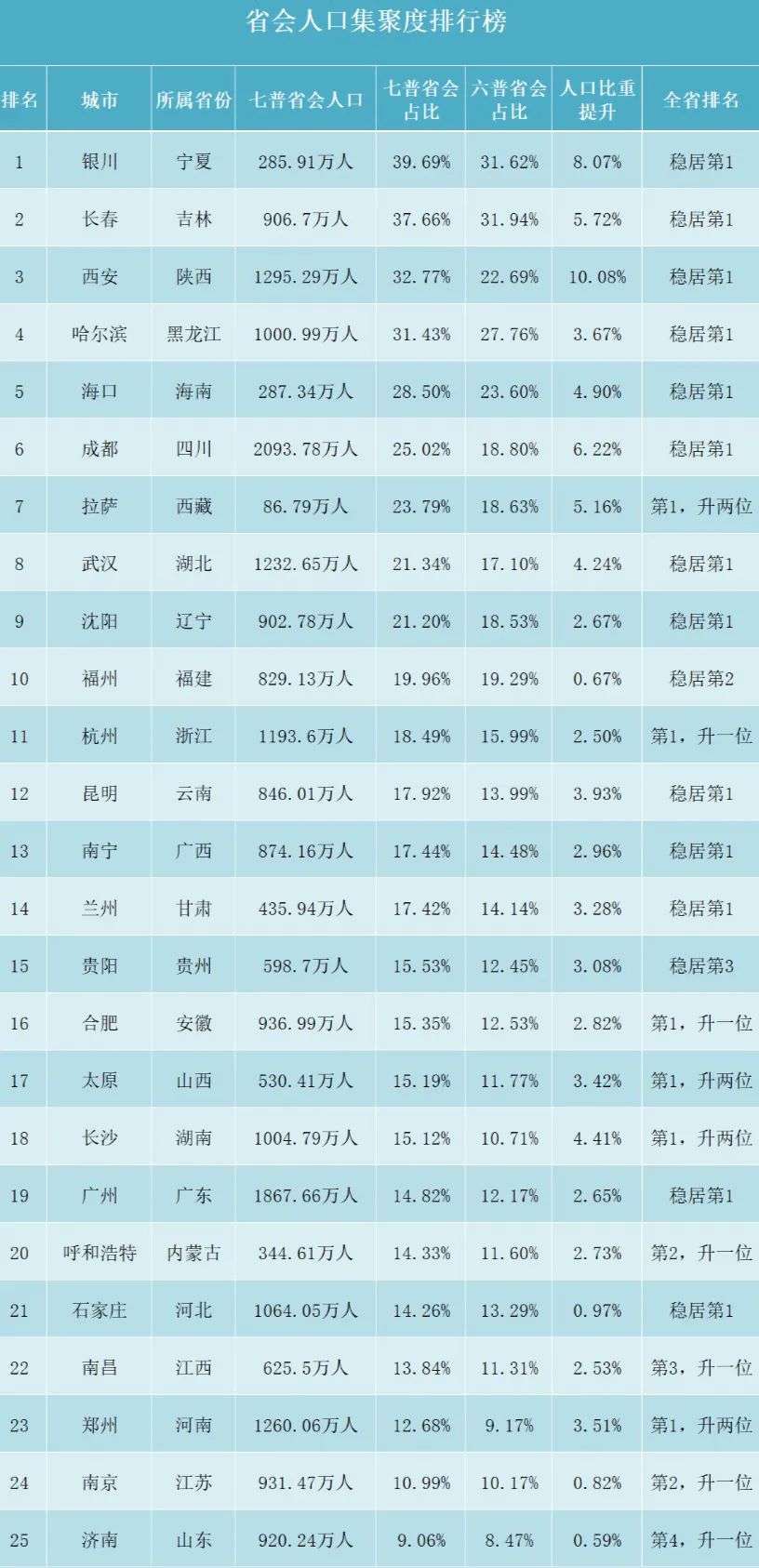 当然,如果西宁的数据公开,其人口聚集度应该能超过银川,排名第一。因为在六普数据中,西宁的常住人口占全省的比重就达到39.25%,这一次很有可能蝉联全国第一。