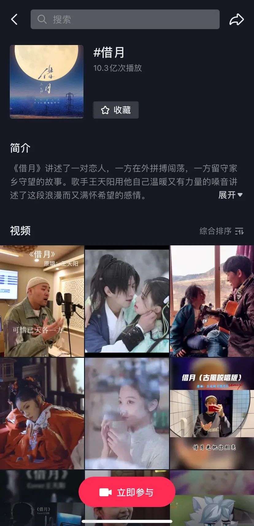 《借月》则凭借引发热剧《山河令》剧粉情感共鸣走红抖音,随后登上各大音乐流媒体平台的热搜榜,并最终成为《山河令》官方推广曲。截至5月21日,该歌曲在抖音平台已有7.4万用户使用,在抖音的话题累计播放量已达10.3亿。