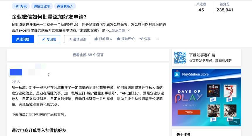 资产是需要建设和投资的,将用户往私域流量导入并不容易。知乎上有超过100个“微信/企微如何批量加人”的问题,下面全是尘锋、艾客、微伴、加一私域等一众服务商提供的解决方案。无论是成熟抑或刚起步,SaaS或者定制的模式,都在强调「企微批量加人/导流」的能力是当前快速积累私域流量首要解决的核心问题。