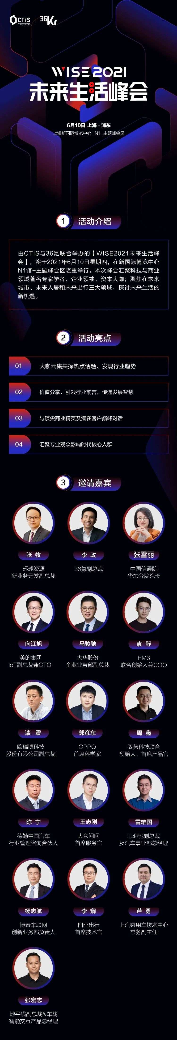 2021年6月10日,由CTIS与36氪联合举办的“WISE2021未来生活峰会”将在新国际博览中心N1馆-主题峰会区开幕,本次峰会汇聚了科技与商业领域著名专家学者、企业领袖、资本大咖;峰会聚焦未来城市、未来人居和未来出行三大领域,共同探讨未来生活的新机遇。