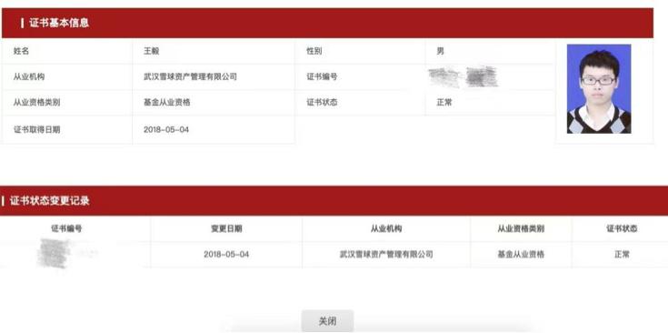 王毅在中国证券投资基金业协会(以下简称中基协)的备案信息显示,他是在2018年5月取得了基金从业资格,并在武汉雪球资本从业。