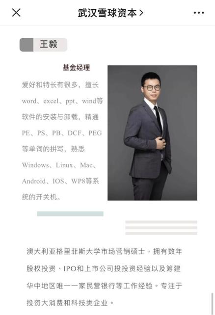 事实上,王毅这段引起行业广泛关注的简介是“武汉雪球资本”官方微信公众号最近发出来的,文章名字叫做“认识雪球”。除了创始合伙人、风控负责人和总经理等高管,文章一共就介绍了两位基金经理,王毅排在第一位。