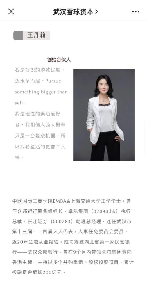 王丹莉是上海交通大学工学学士和中欧国际工商学院EMBA。她的简介显示,其曾任众邦银行筹备组组长、卓尔集团(02098.hk)执行总裁、长江证券(000783)助理总经理,有近20年金融从业经验,成功筹建湖北省第一家民营银行——武汉众邦银行,曾在9个月内带领卓尔集团登陆香港主板,主持过多个并购重组、股权投资项目,累计投融资金额逾200亿元。