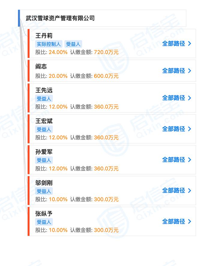 启信宝数据显示,“雪球资本”的全称为武汉雪球资产管理有限公司,成立于2015年10月、注册资本3000万元。股权结构如下: