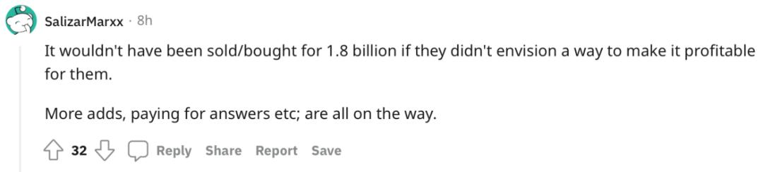 「没有人会花18亿美元去买一个无法盈利的东西。更多的广告,付费的答案等等都将到来。」