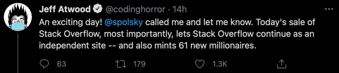 联合创始人Jeff Atwood发文表示很兴奋,并且安慰大家说SO会继续是一个独立的网站。(顺便产生了61个新的百万富翁)