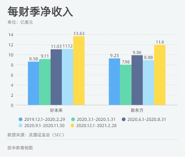 上月,两家教培巨头相继披露了截至2021年2月28日最新季度财务数据。在报告期内两家公司净收入双双上涨,好未来净收入13.63亿美元,同比增长58.9%;新东方的净收入为11.9亿美元,同比增长29%。