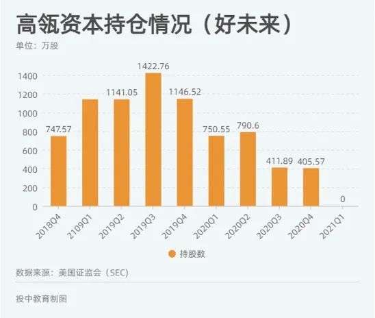 从2019年四季度开始,除2020年第二季度增持约40万股外,高瓴资本开始逐步减持好未来,一直到2021年第一季度清仓了好未来余下405.57万股。