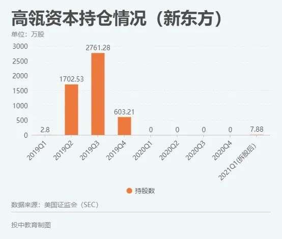 高瓴虽建仓新东方,但仅购入7.88万股。这还是在新东方2021年3月10日施行1拆10的普通股拆股计划后的买入行为,买入股价为每股17.5美元。