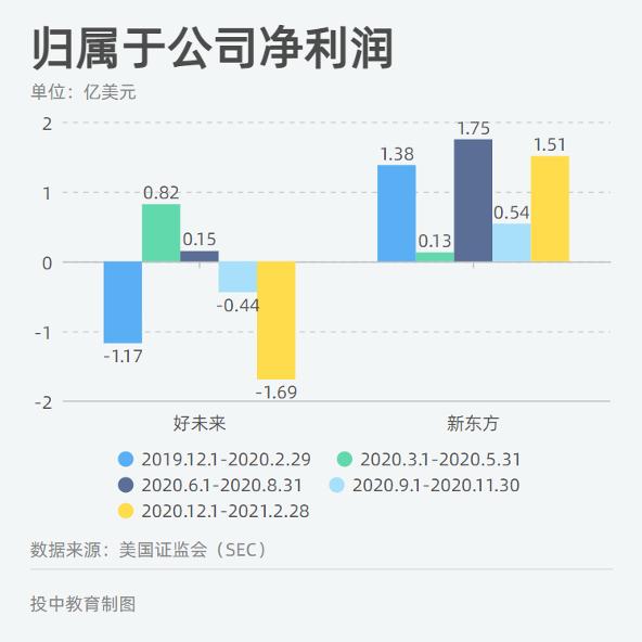 事实上,在2019年12月到2021年2月,虽经受疫情冲击,新东方一直处于盈利的状态,好未来却难言稳定。在疫情初期(2019年12月-2020年2月),好未来就出现了归属于公司的1.17亿美元的亏损,此后一度扭亏,但又在截至2020年11月30日的财季中出现了亏损,并在下一季度进一步扩大,达到了1.6 9亿美元。