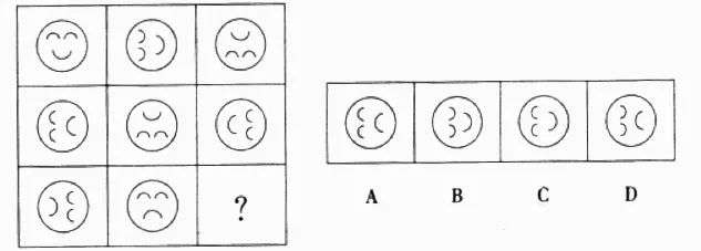 但这表情能有什么规律呢?盯着它们看,简直让人火大,一怒之下想选D表达内心的不满……其实,答题思路跟表情含义没有半毛钱关系:从左到右全是逆时针旋转,同时左到中眼睛翻转,中到右嘴巴翻转,因此答案是C。好气哦,但还是要微笑呢。