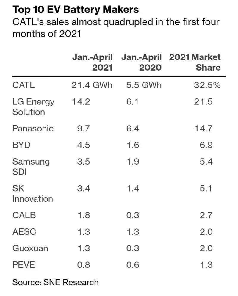 图注:SNE Research 2021年前四个月全球电池装机量数据