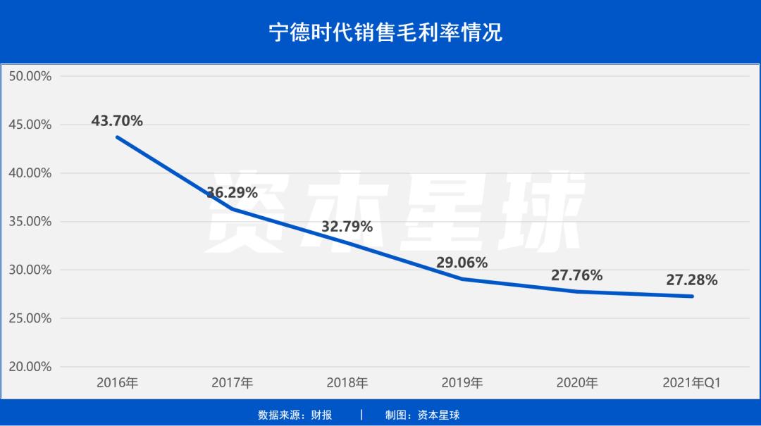 有分析人士认为,随着原材料成本飙升动力电池企业利润将越来越薄,在上下游进一步挤压利润空间的情况下,它们会考虑自己造车以缓解压力,只有与整车企业紧紧地捆绑在一起,动力电池企业才有可能赢得先机。从财报来看,宁德时代的毛利率的确一直处在下滑区间,2019年和2020年的毛利率分别为29.06%和27.76%,2021年一季度进一步下滑至27.28%。