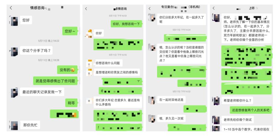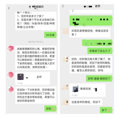 不管是来自抖音还是知乎、微博的情感导师,也不管之前的助理是否有询问过。这些导师上来就是几乎一模一样的问题“你们多大年纪”、“恋爱多久了”、“怎么认识的”、“主要分手原因是什么”......