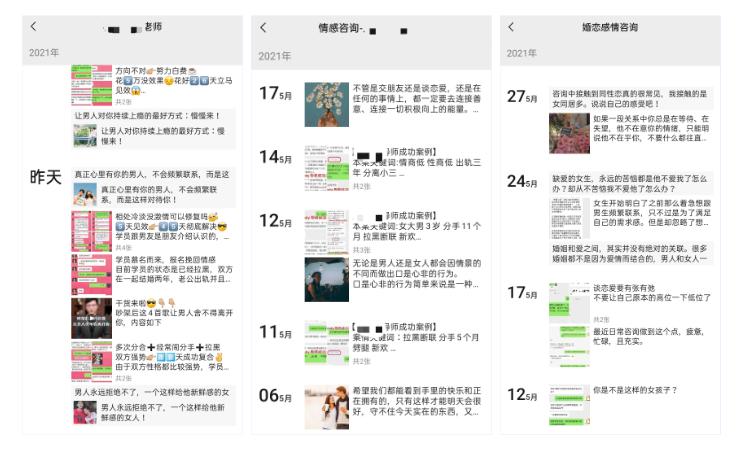 综合来看,其实顾问的存在、朋友圈的人设以及开场白,这几位导师都如出一辙。“螳螂财经”其实也能够猜测到他们的用意:第一是铺垫,让客户能够更快的进入角色。第二是塑造,利用顾问、案例,塑造出一个专业的情感导师形象。第三是了解,即对客户的感情问题有一个详细的了解,以便抓住痛点,对症下药。