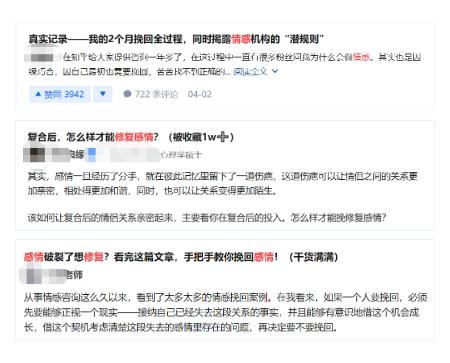 另一方面,他们盘踞在“你们找的情感挽回机构真的有用吗?”、“如何在出轨后修复感情”等问题下方,一边在众多的回答、回复中寻找客户,一边自己下场,编造出感情破损的悲惨经历,然后剖析心路历程,是如何在情感导师的帮助下,一步步的挽回的,最后艾特出自己的情感导师,来为其引流。