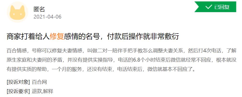据她描述,整个服务过程仅接到了四次电话,在了解了这位女士的原生家庭和夫妻间的矛盾后,只说了一些“情绪价值的三个方面”等万金油的空话,并没有提供实操指导,电话的6-8个小时结束后微信就经常不回应,她认为并没有提供实质的帮助。