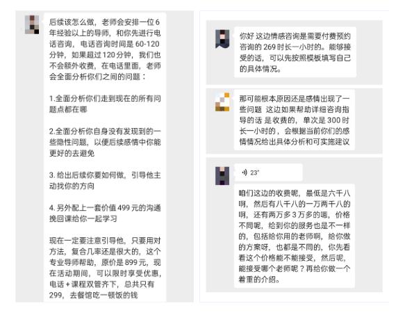 为了促成付费,这些情感导师们做了哪些努力?在“螳螂财经”的实地取材中发现,根据用户的付费意愿,大致分为以下五种手段: