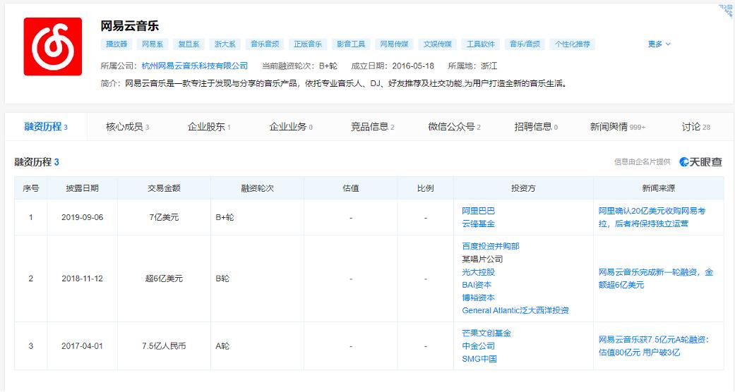 自虾米失去斗志,也只有网易云还在与腾讯音乐存在竞争,据天眼查APP显示,阿里与百度都是网易云音乐背后的融资人,而虾米音乐与百度音乐“失声”后,或许阿里与百度也将网易云音乐作为与腾讯系音乐竞争的最大的赌注。