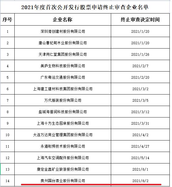 但是,中国证监会6月4日披露的“首次公开发行股票审核工作流程及申请企业情况”表显示,贵州国台酒业在6月2日终止了IPO审查。