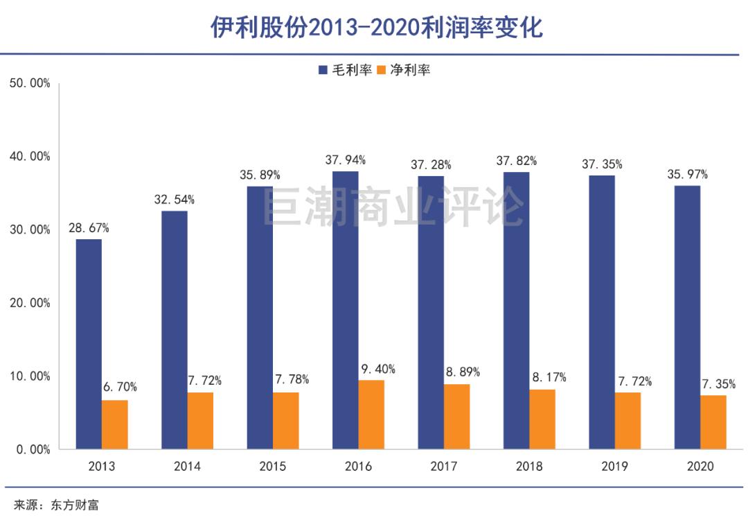 2020年的财务数据显示,伊利股份毛利率35.97%,自2014年以来长期保持在35%左右,数据亮眼。但是净利率水平却从来没超过10%,2020年为7.35%;