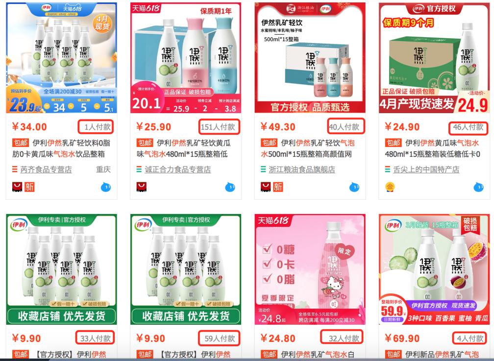 伊利伊然气泡水淘宝搜索第一页展示
