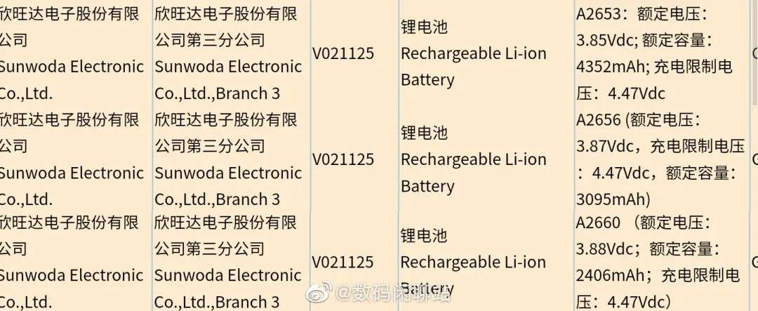 根据入网信息,iPhone 13系列会有三个不同容量的电池,额定容量分别为4352mAh、3095mAh、2406mAh,对应A2653、A2656、A2660三个型号。