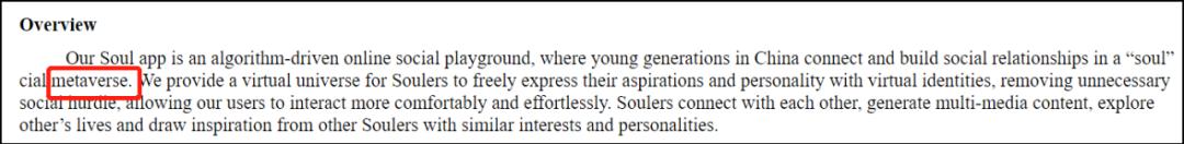其中最富“学习”能力的中国公司,是一家一直使用英文品牌名称在社交软件领域打拼的公司——Soul。这家号称以让“这个世界没有孤独的人”为初心的陌生人交友软件商,在其5月上旬提交的赴美IPO招股说明书中,自称道:“我们要建立一个以灵魂为链接的元宇宙”(Our mission is to build a “Soul”cial metaverse)。