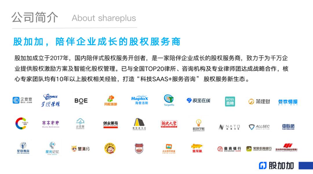 股加加——企查查&同程资本战略联盟品牌,国内陪伴式股权服务开创者,是一家陪伴企业成长的股权服务商,致力于为千万企业提供股权激励方案及智能化股权管理。目前,股加加服务的企业已超6000+,覆盖全行业多领域,其中不乏很多高新技术企业。
