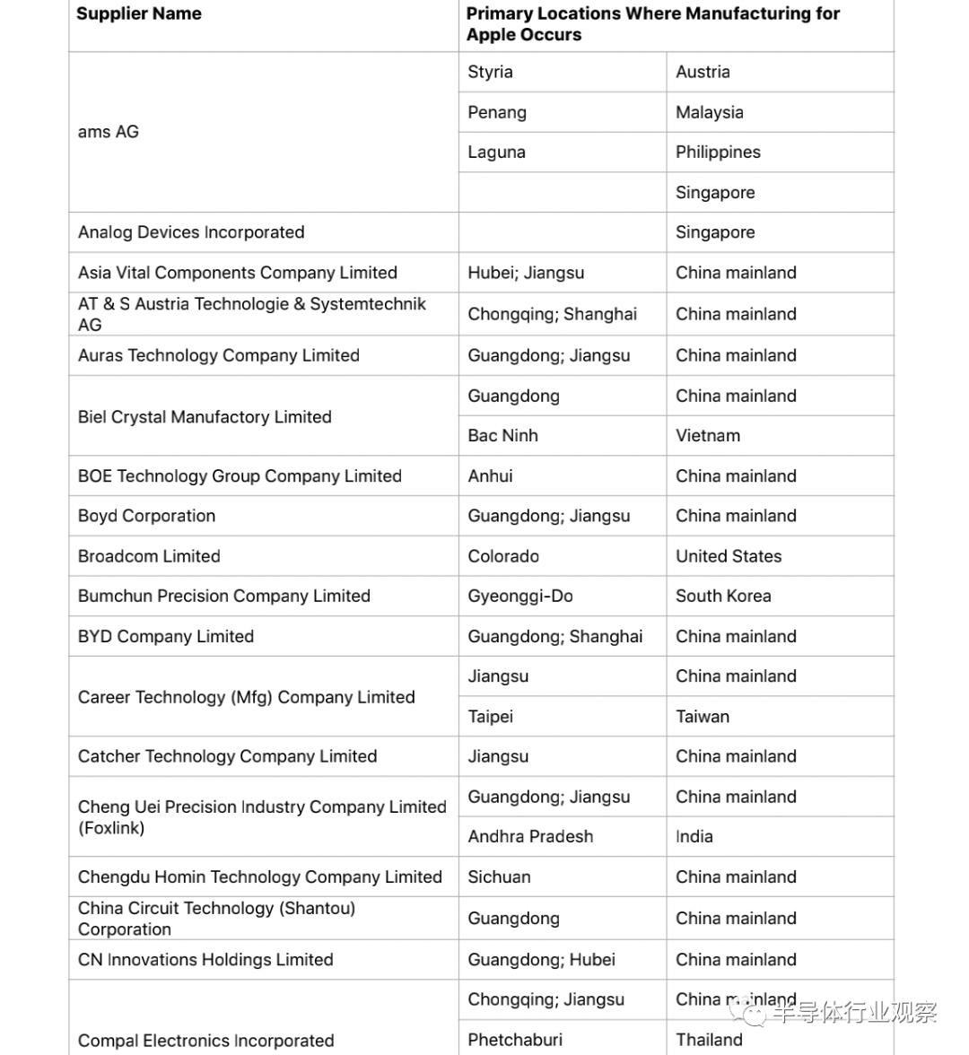 新增加的中国大陆厂商包括:福建南平铝业、兆易创新、江苏精研、领益智造(原领益科技)、得润电子、长盈精密、富驰高科、苏州胜利精密、深圳市新纶科技、天马微电子、广州众山金属科技、苏州鑫捷顺五金机电12家企业。而广东朝阳电子、吉林利源精制等四家被移除。总部位于香港的供应商上海实业控股在上一年被除名后重新回到供应链名单。然而,国内供应商雅特生科技、国泰航空和创亮科技均未出现在名单中。