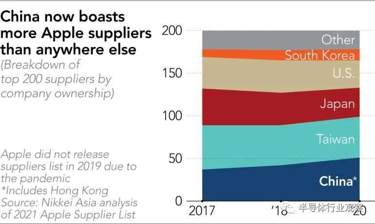 苹果在中国的供应商逐年增加,目前最多(图源:日经亚洲评论)