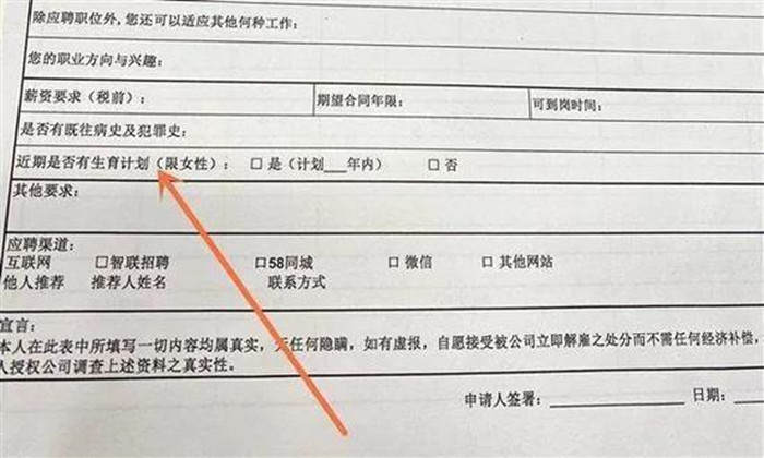 2019年2月,人力资源部等九部门就联合印发《关于进一步规范招聘行为促进妇女就业的通知》规定:不得以性别为由限制妇女求职就业、拒绝录用妇女,不得询问妇女婚育情况,不得将妊娠测试作为入职体检项目,不得将限制生育作为录用条件。