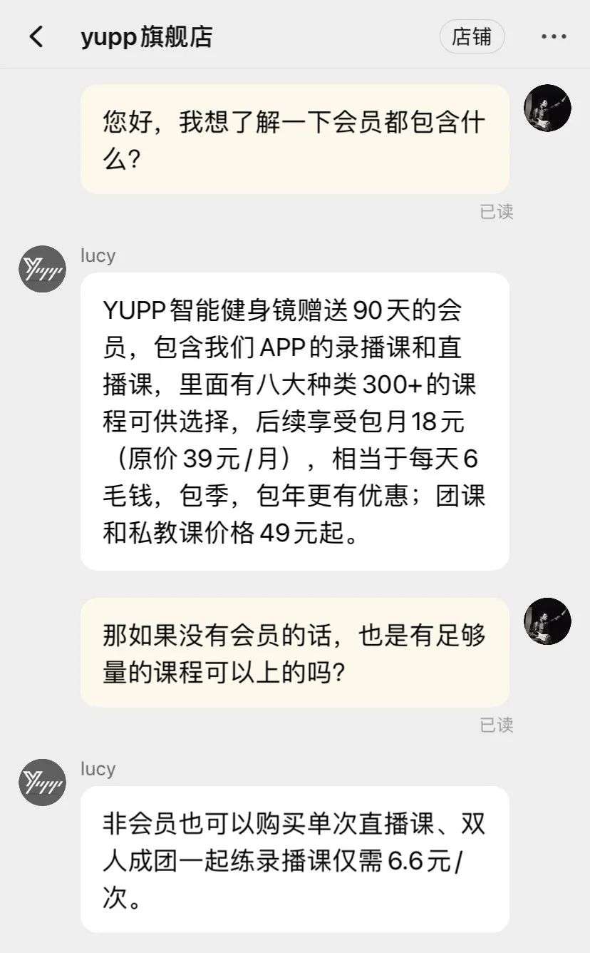 或许智能健身镜市场现实的火爆和激烈竞争,也能从我们咨询完产品和会员体系后,销售客服们每个一小时一条消息中,那不间断的热情和急迫中得以窥见:
