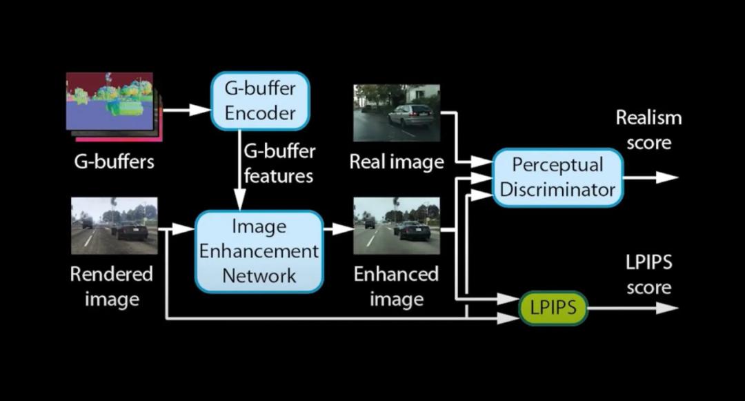 图像增强网络将游戏的渲染帧和来自 G-buffer 编码器的特征作为输入,生成逼真版的图像。鉴别器和 LPIPS 损失函数和其他组件则在训练期间使用。研究者通过评估生成图像与原始游戏渲染帧的一致性和比较生成图像与真实图像的逼真质量来给该增强网络的输出评级。