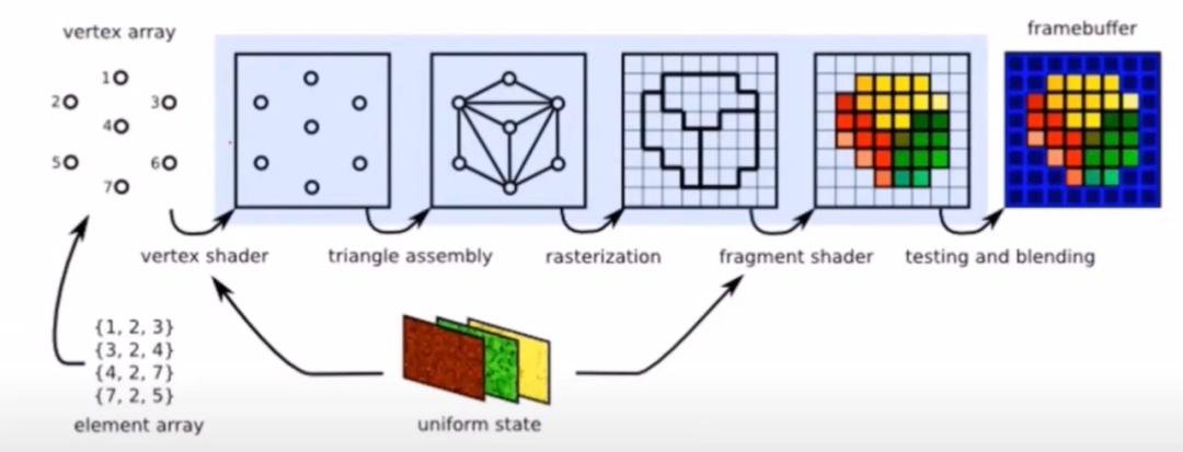在渲染每一帧前,顶点必须经过一系列矩阵乘法,以将顶点的的局部坐标映射到世界坐标、相机空间坐标、图像帧坐标。索引缓冲区将顶点捆绑成三个一组以形成三角形。这些三角形被光栅化——或转换成像素——然后每个像素通过它自己的一组矩阵操作,根据材质颜色、纹理、反射和折射图、透明度级别等来确定它的颜色。