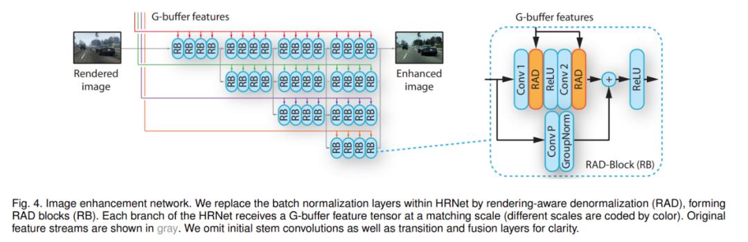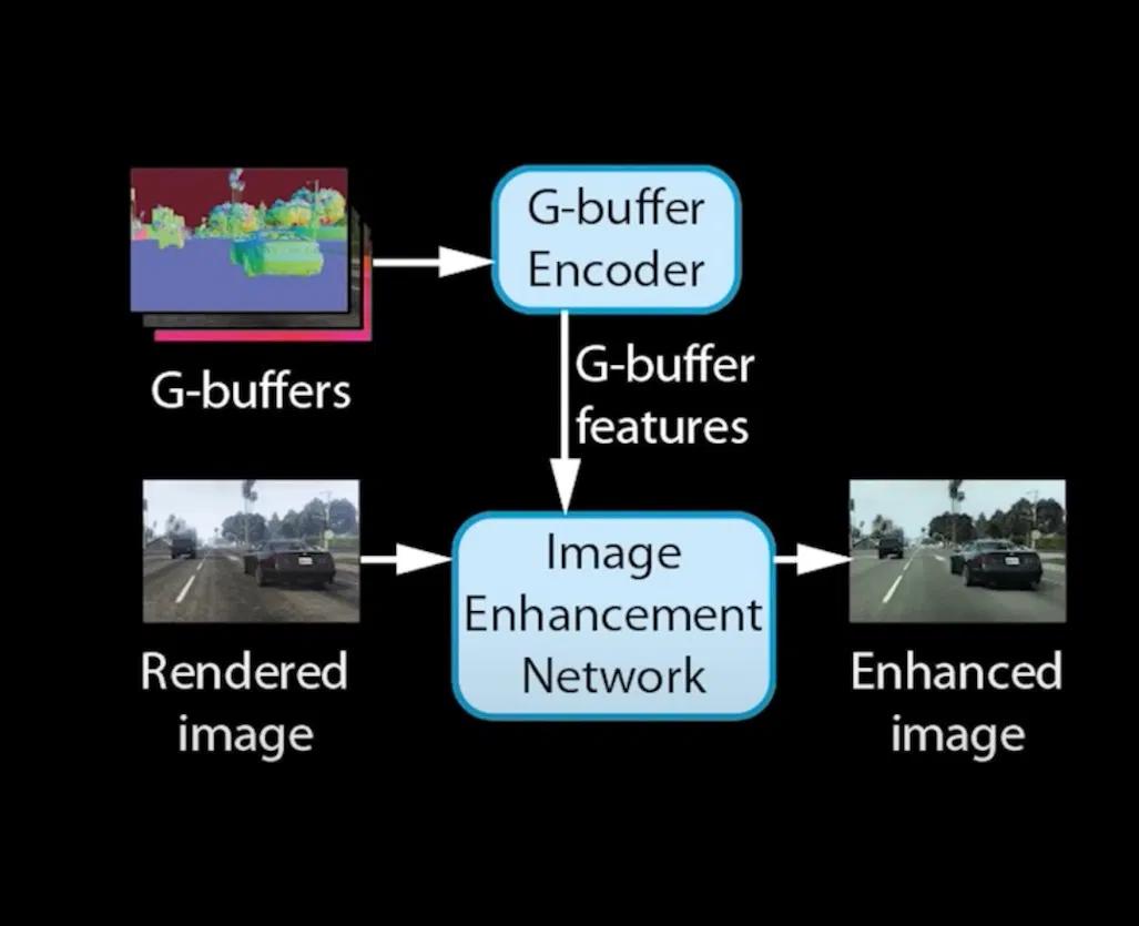 G-buffer 编码器将不同的渲染图转换为一组数字特征。多个 G-buffer 分别用作表面法线信息、深度、反照率、光泽度、大气和目标分割的渲染图。系统中的神经网络使用卷积层来处理这些信息,并输出一个包含 128 个特征的向量,以提升图像增强网络的性能,并避免像其他类似技术一样产生伪影。G-buffer 可以直接从游戏引擎获得。