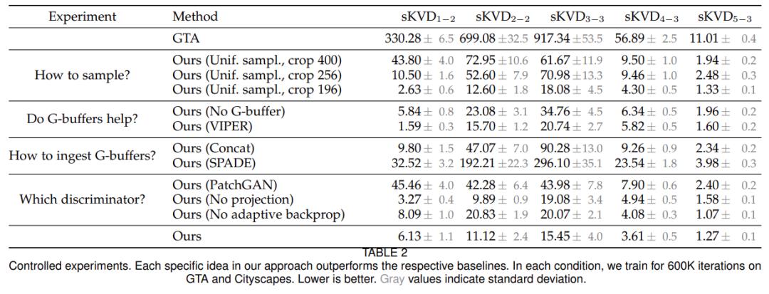 并进行了对照实验来评估该方法中一些特定设计思路的影响,包括采样策略、G-buffer 的作用等,实验结果如下表所示: