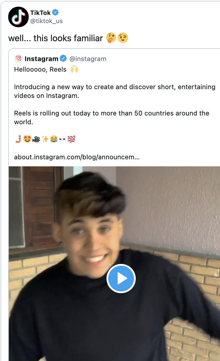 图源:TwitterInstagram官宣发布Reels,TikTok转发