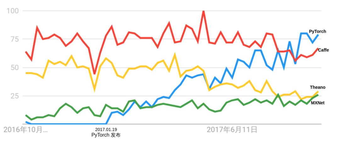 PyTorch自发布起关注度就在不断上升,截至2017年10月18日,PyTorch的热度已然超越了其他三个框架(Caffe、MXNet和Theano),并且其热度还在持续上升中。