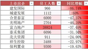 其中人员降幅超过50%的有2家,建发降幅高达86.74%;降幅40%-50%的有光明、合景泰富2家;降幅30%-40%的有泰禾、富力2家;人员降幅20%-30%的有祥生、北大资源2家;人员降幅10%-20%的有保利置业1家。今年房企人员的缩减与往年有所不同。