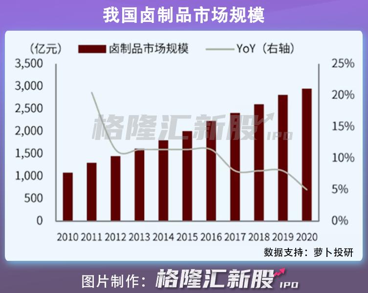 根据弗诺斯沙利文的数据,2015-2020年,休闲卤制品复合增长率达24.1%,成为休闲食品中增速最快的品类;预计在未来5年将以每年13%的增长率持续提升,到2025年其市场规模或将突破2200亿元。其中,休闲型卤味零食占40%,剩下六成属于佐餐卤制品;同时,预计到2025年休闲卤制品整体门店数量增至约16.4万家。