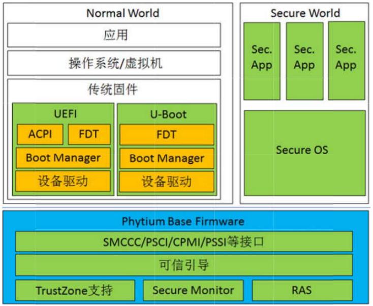 在国产化方面,飞腾、华为等都推出了基于ARM架构CPU的TrustZone方案,如下图所示是支持TrustZone技术的飞腾FT-2000CPU的系统软件架构。
