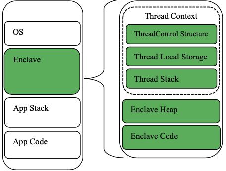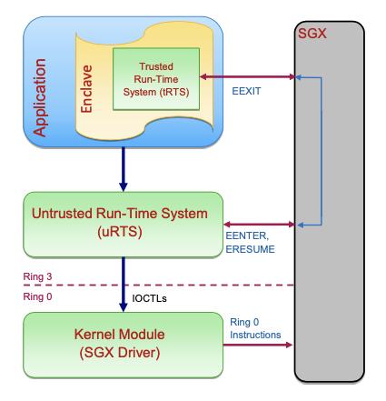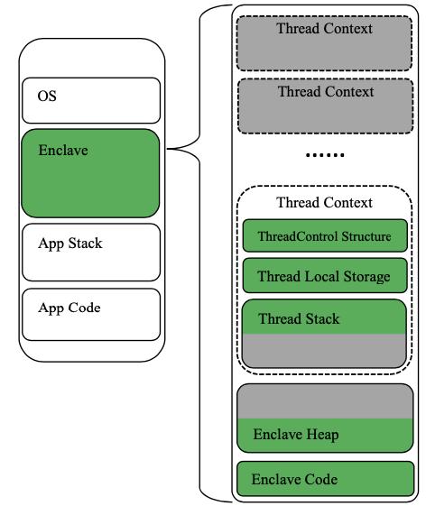 SGX Enclave运行时主要由三个部分组成,分别是运行在Ring0的系统模块即SGX驱动,和运行在Ring3中的非可信运行时系统即uRTS,以及运行在EPC内存区的可信运行时系统(tRTS),其中Enclave代码和数据放置在被称为Enclave Page Cache。