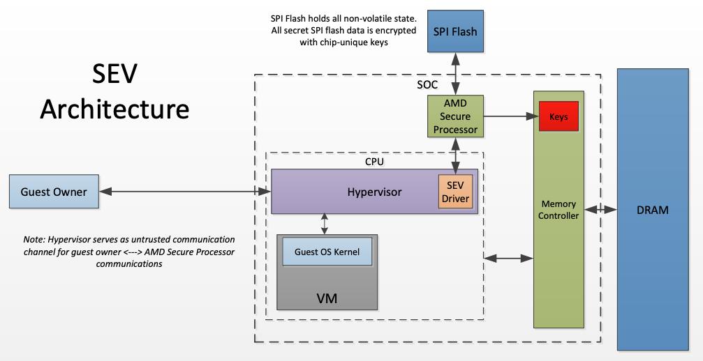 SEV是由AMD提出的安全虚拟化Secure Encrypted Virtualization技术。主要有三个核心技术: