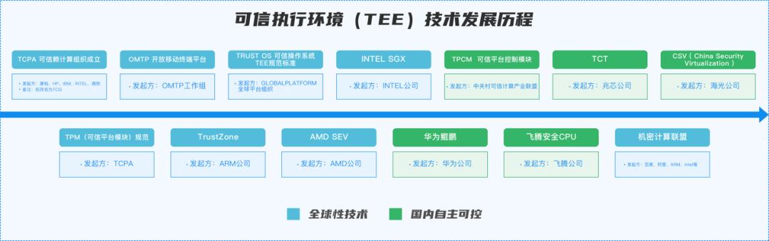TEE相关标准组织的成立:1999年,康柏、HP、IBM、Intel、微软等企业发起成立了可信计算平台联盟TCPA(Trusted Computing Platform Alliance)该组织于2003年改组为可信计算组织TCG,并制定了关于可信计算平台、可信存储和可信网络链接等一系列技术规范。