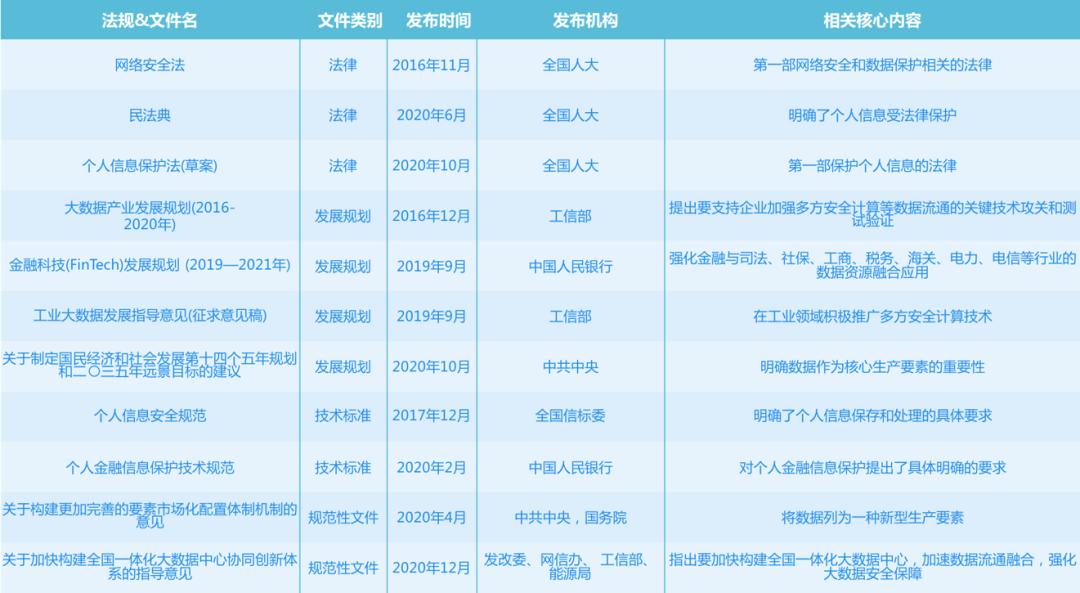 随着数据量量级迅速增长,以及数据自身的特殊性质,数据流通安全问题显得尤为重要。除企业和个人对数据隐私愈发重视外,国家在数据流通安全方面的法律法规也逐渐完善,并且推出了一系列法律法规。