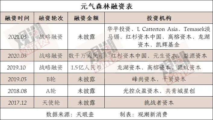 今年3月,元气森林完成最新一轮5亿美元战略融资,本轮融资由新股东华平投资、L catterton和老股东红杉资本中国为领投方,淡马锡跟投,此外高榕、龙湖等多位老股东继续跟投。截至目前,元气森林已经完成6轮融资。